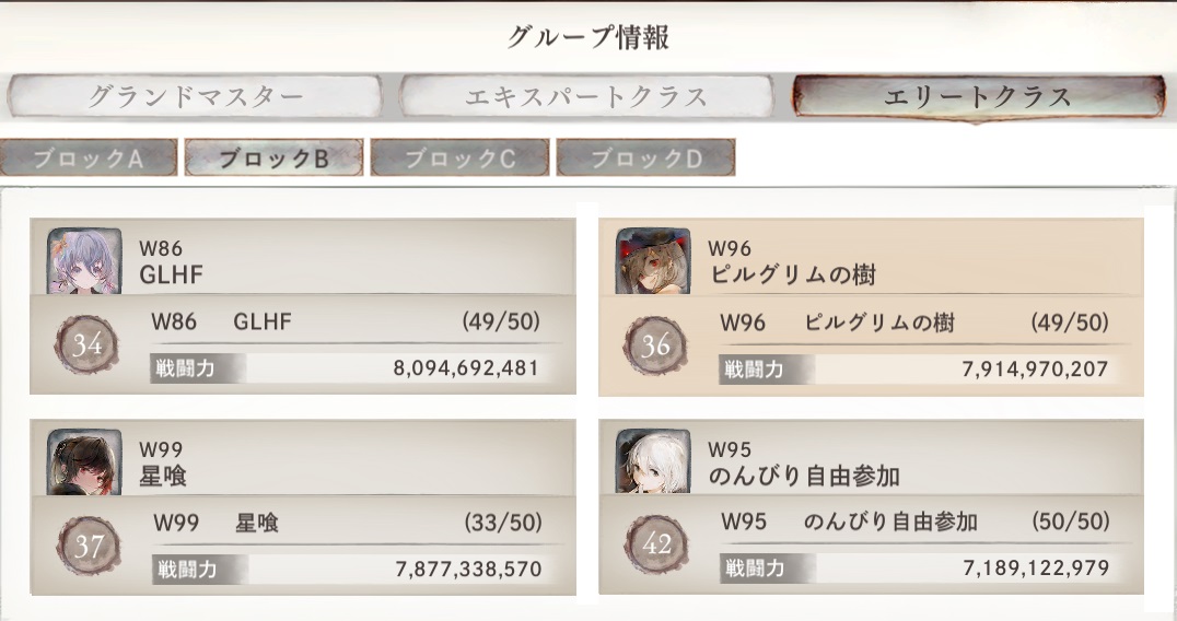 『ピルグリムの樹』は、総合戦闘力33~48位で構成される「エリートクラス」に振り分けられた。