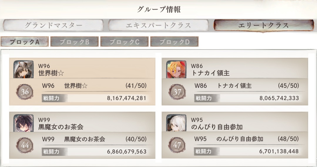 我々『世界樹☆』(「世界樹」より一時的に改名)は、総合戦闘力33位~48位で構成される「エリートクラス」に振り分けられた。