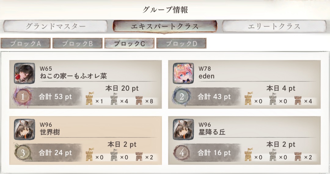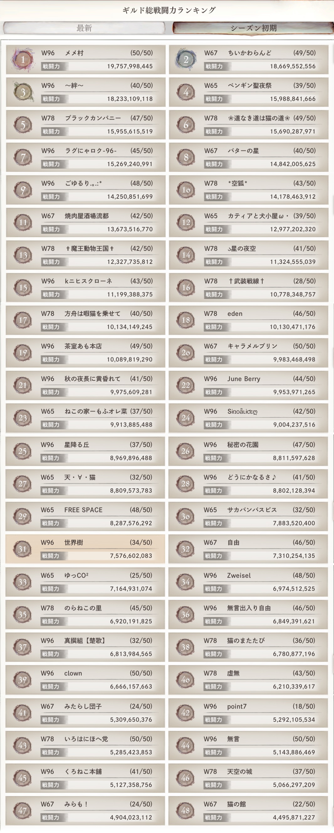 上の画像は結果報告になるが、総合戦闘力では「ねこの家」 23位、「eden」 18位、「世界樹」 31位、「星降る丘」 25位となる。