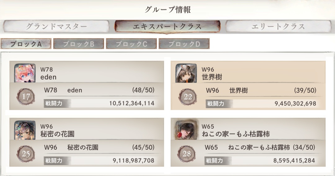 総合戦闘力17位~32位で構成される「エキスパートクラス」に振り分けられた。
